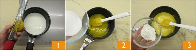 Para preparar las sfogliatelle fáciles, lo primero que hay que hacer es preparar la crema pastelera: calienta en un cazo la leche aromatizada con la piel del limón 1. En otro cazo, vierte el azúcar y las yemas 2. Mezcla con una espátula y añade la harina tamizada 3. Mezcla con cuidado de no incorporar aire.