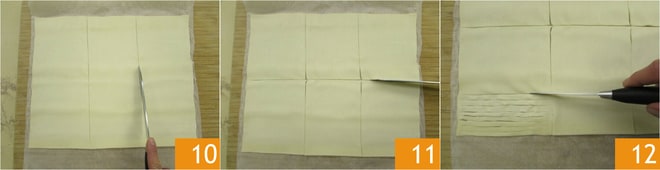 Corta la masa de hojaldre en 3 partes iguales primero en sentido vertical 10, luego en horizontal 11 de manera que obtengas 6 rectángulos de 10x11,5 cm (aproximadamente). Con un cuchillo afilado (o una cortadora de pasta) haz tiras de aproximadamente 4 mm de grosor en la mitad del rectángulo: también debes dejar 1 cm del borde para no cortar completamente 12 y mantener las tiras unidas entre sí.