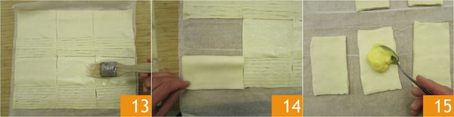 Pincela la superficie de la masa con la mitad de la mantequilla derretida 13 y dobla los rectángulos sobre sí mismos, con la parte sin cortes cubriendo la parte con cortes 14. Coloca una cucharadita de crema pastelera en el centro del rectángulo doblado 15.
