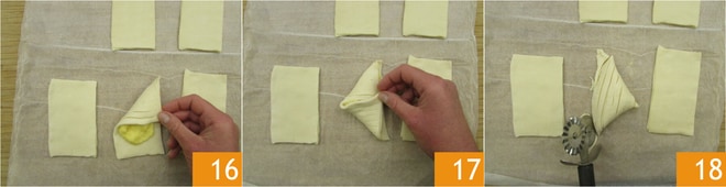 Lleva una esquina hacia el centro del rectángulo 16 y presiona la masa para que se adhiera bien 16. Lleva la otra esquina hacia el centro formando un triángulo 17. Con los dedos, haz una ligera presión para unir los dos bordes de la masa para mantener la forma durante la cocción. Aplasta bien con la punta de los dedos también el lado largo. Gira la sfogliatella por la parte de la decoración y, con una ruedecilla, refínala si es necesario 18.
