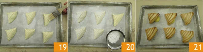 Coloca las sfogliatelle sobre una bandeja forrada con papel de horno con la parte de la unión hacia abajo, pincela con la mantequilla derretida restante la superficie 19 y espolvorea con azúcar glas 20. Hornea en un horno estático precalentado a 200° durante unos 15 minutos, o hasta que estén doradas. Saca del horno y deja enfriar 21 antes de espolvorear con más azúcar glas.