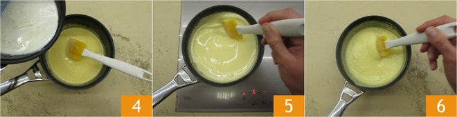 Lleva la leche a ebullición y luego viértela poco a poco sobre la mezcla de yemas, azúcar y harina y remueve. Vuelve a ponerla al fuego, cocina a fuego moderado 4 5 hasta que la crema se haya espesado 6.