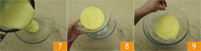 Vierte la crema en un bol 7 y colócala en otro bol con hielo, para acelerar el proceso de enfriamiento sin que la crema pierda brillo y consistencia 8. Cubre con film en contacto y deja enfriar 9.