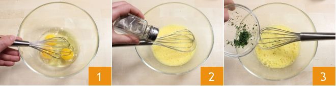Para realizar los hojaldres con aceitunas y cubitos de tortilla, empieza por preparar la tortilla: en un bol, coloca los huevos enteros, bátelos con un batidor 1, añade sal, pimienta 2 y aromatiza con el perejil picado 3