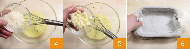 y por último agrega los quesos: el parmesano rallado 4 y el queso scamorza cortado en daditos 5. Humedece y estruja una hoja de papel de horno y forra un molde de 15x21 cm 6.