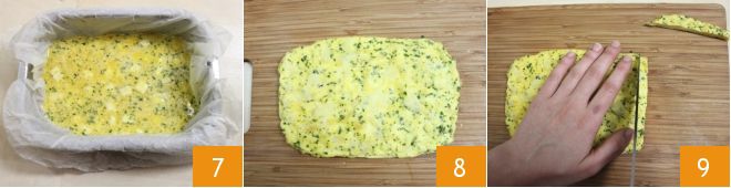 Vierte la mezcla en el molde 7 y hornea en horno precalentado a 180° durante unos 25-30 minutos. Sácalo, déjalo templar y desmolda sobre una tabla de cortar 8. Ahora corta la tortilla en tiras de aproximadamente un centímetro de ancho 9