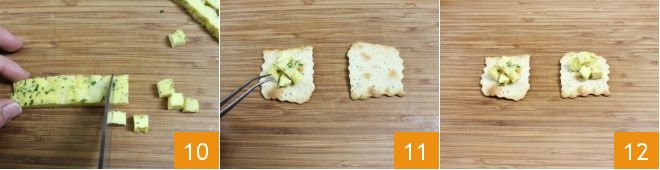 y de estas saca cubitos de aproximadamente 1 cm 10. Con la ayuda de unas pinzas de cocina, coloca los cubitos de tortilla sobre los hojaldres 11. ¡Tus hojaldres con aceitunas y cubitos de tortilla están listos para ser crujidos! 12