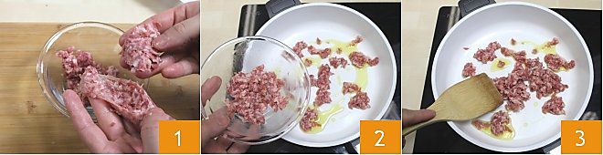 Para preparar los hojaldres con migas de salchicha desmenuza la salchicha con las manos 1 y dórela en una sartén antiadherente con dos cucharadas de aceite de oliva virgen extra, durante unos minutos a fuego fuerte (2-3).
