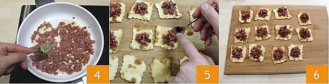 Los hojaldres con migas de salchicha son un sabroso aperitivo tipo finger food que se prepara fácilmente en pocos minutos: es suficiente dorar la salchicha desmenuzada en una sartén antiadherente, aromatizarla con hinojo y adornar vuestros hojaldres con la mezcla obtenida.