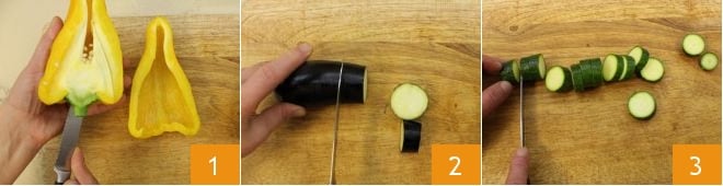 Para realizar el shish kebab, lava todas las verduras y sécalas, corta el pimiento a la mitad 1, elimina el tallo, las semillas y los filamentos internos, luego corta cada mitad en dos a lo largo. Recorta las berenjenas y córtalas en rodajas 2, haz lo mismo con el calabacín 3,