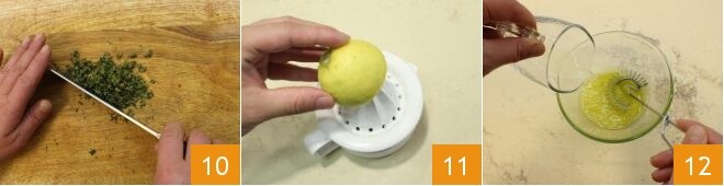 Reserva las verduras en boles separados, servirán para componer los shish. Escurre las alcaparras, sécalas y luego pícalas junto con las hierbas aromáticas 10, exprime el zumo de limón 11 y cuélalo, en un bol pequeño emulsiona el aceite de oliva y el zumo de limón 12
