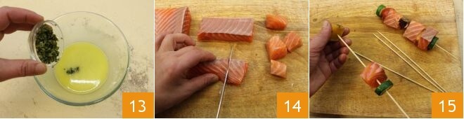 añade el picado de hierbas aromáticas y alcaparras 13, reserva la marinada obtenida y ocúpate del salmón. Elimina cualquier espina del filete con unas pinzas especiales, luego corta el salmón en cubos de 2cm x 2cm 14, toma un pincho de madera y monta los pinchos alternando un cubo de salmón (un total de 4 cubos por cada pincho) con los diferentes bocados de verduras asadas 15.