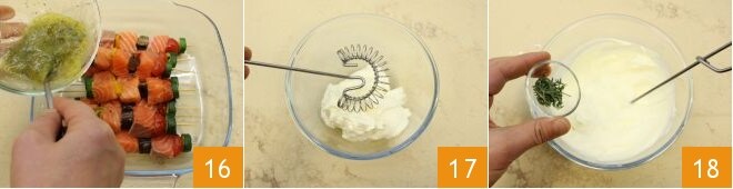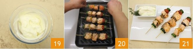 Coloca los shish en una fuente y sazónalos con la marinada 16, cubre con film transparente y déjalos marinar en el frigorífico durante 30 minutos. Mientras tanto, prepara la salsa de acompañamiento: en un bol pequeño vierte el yogur y suavízalo mezclando con el batidor 17, aromatiza con una pizca de sal y hojas de tomillo fresco 18,