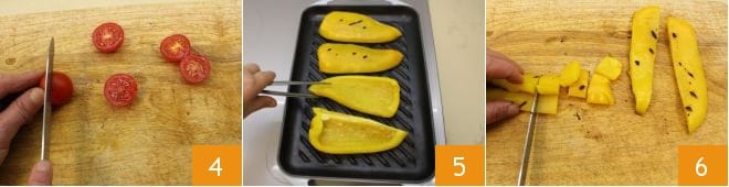 divide los tomates cherry a la mitad 4 y pasa a la cocción, coloca una parrilla de hierro fundido en el fuego, caliéntala y asa todas las verduras. Coloca los pimientos y cocínalos por ambos lados 5 durante menos de 1 minuto, o el tiempo necesario para crear las típicas marcas de la parrilla. Después de la cocción, corta el pimiento en cubos 6 y reserva.