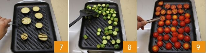 Continúa asando de la misma manera las berenjenas 7, los calabacines 8 y los tomates 9.