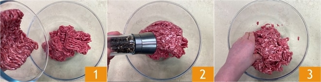 Para preparar el smash burger, lo primero es mezclar la carne picada de ternera y la carne picada de cerdo en un bol 1, añadir pimienta 2 y amasar con las manos hasta obtener una mezcla homogénea 3.