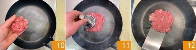 Colocad una albóndiga a la vez en la sartén caliente 10, luego aplastadla de inmediato con un prensador de carne, asegurándoos de presionar muy fuerte para aplanar bien la carne 11. Después de 60 segundos, dad la vuelta a la hamburguesa con una espátula 12.