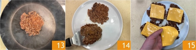 Dejad cocinar el otro lado durante un minuto y medio como máximo 13, luego trasladad la hamburguesa a un plato 14 y proceded de esta manera para cocinar las demás. Cubrid de inmediato las hamburguesas con el queso en lonchas para que se derrita con el calor 15.