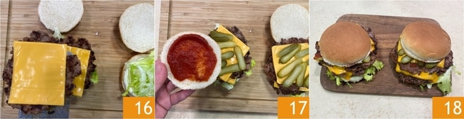 En este punto, estáis listos para completar los panes: apilad 2 hamburguesas con queso en cada pan 16, luego añadid los pepinillos en rodajas. Finalmente, cerrad con la parte superior del pan que habréis untado con ketchup 17. ¡Vuestras fantásticas smash burgers están listas para ser disfrutadas 18!
