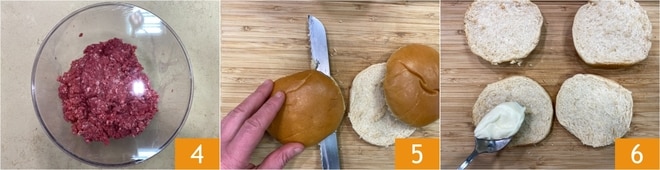 Tapar con film transparente 4 y guardar en el frigorífico mientras preparáis los demás ingredientes para el pan; debéis tener todo listo para poder cocinar las hamburguesas en el último momento. Cortad los panes por la mitad 5, luego untad la parte inferior con mayonesa 6.