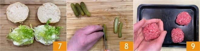 Añadid también las hojas de lechuga 7 y cortad los pepinillos en rodajas 8. Reservad y poned al fuego una sartén de hierro, hierro fundido o acero, deberá estar muy caliente. Mientras tanto, retomad la mezcla de carne, divididla en 4 porciones de aproximadamente 100 g cada una y dadles forma con las manos para formar una albóndiga 9.