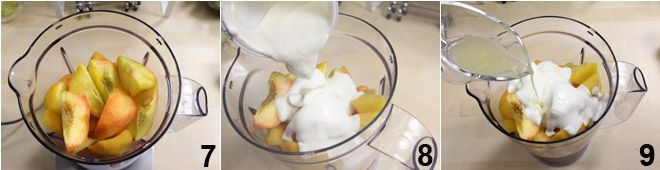 y los melocotones 7. Verted el yogur 8 y el jugo del limón 9, cerrad la batidora y ponedla en marcha. Continuad batiendo hasta obtener una mezcla cremosa. ¡Aquí tenéis listo vuestro fresquísimo smoothie de yogur!