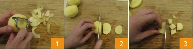 Para preparar la sopa de patatas, comienza llevando a ebullición el Caldo de verduras en una olla, luego ocúpate de las patatas: pélalas 1 y córtalas en rodajas 2 y luego reduce cada rodaja en cubos de aproximadamente 1 centímetro 3.