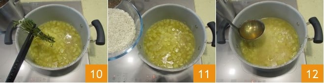 Después de 20 minutos, retira el bouquet aromático usando unas pinzas de cocina 10 y añade el arroz 11. Puedes usar tanto arroz Arborio como Carnaroli. Añade nuevamente el caldo hirviendo hasta cubrir todo el arroz y las patatas 12.