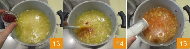 Luego añade el concentrado de tomate 13 y mezcla bien para integrarlo 14. Añade también la sal 15