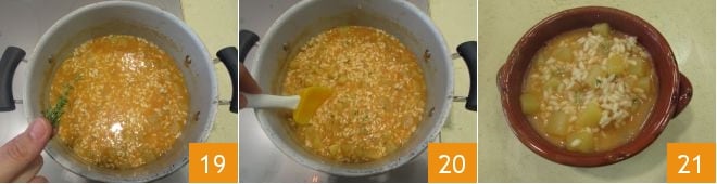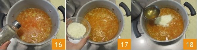 y la pimienta 16 y continúa la cocción durante otros 20 minutos, añadiendo más caldo si es necesario. Cuando el arroz y las patatas estén cocidos, añade el Grana Padano 17 y añade una última cucharada de caldo 18 y, si es necesario, ajusta un poco más de pimienta.