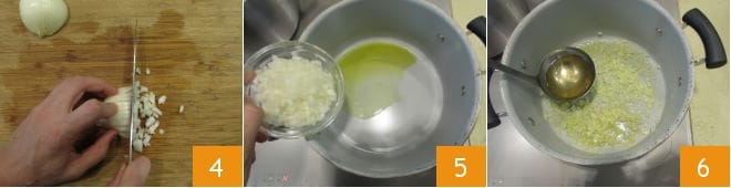 Ahora pasa a la preparación del sofrito: pica la cebolla 1 luego, en una olla grande, vierte el aceite y añade el picado de cebolla 5 dejándola pochar durante unos diez minutos y mojándola cuando sea necesario con un cucharón de caldo caliente para evitar que se queme 6.