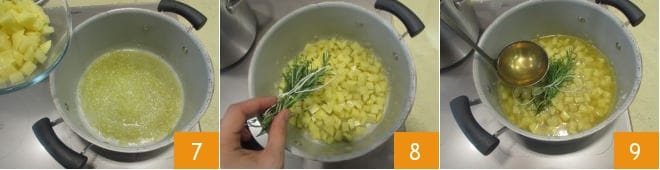 Transcurridos 10 minutos, añade las patatas en cubos 7. Luego une los ramitos de tomillo y romero (reservando uno de tomillo) con un cordel de cocina y añádelos a la olla 8. Cubre todo con el caldo hirviendo 9 y deja cocer durante 20 minutos.