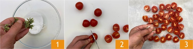 Para preparar los espaguetis a los tres tomates, como primer paso mezcla azúcar y orégano en un bol 1. Corta por la mitad los tomates cherry 2 y colócalos con el corte hacia arriba en una bandeja cubierta con papel de horno. Distribuye el condimento sobre los tomates cherry 3 y hornea en horno ventilado, precalentado, a 160°C durante 30 minutos. Una vez cocidos, deja que se templen.