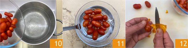 Pasa a los tomates piccadilly: lávalos y haz un corte en cruz en la piel. Sumérgelos en una olla con agua hirviendo 10 y escáldalos por un minuto. Escurre los tomates y transfiérelos a un bol con agua fría 11, luego elimina la piel: de esta manera será muy fácil quitarla 12.