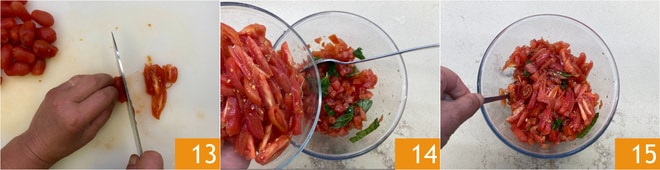 Divide los tomates por la mitad, elimina las semillas y corta la pulpa en sentido longitudinal 13. Viértelos en el bol con los tomates San Marzano 14 y mezcla 15.