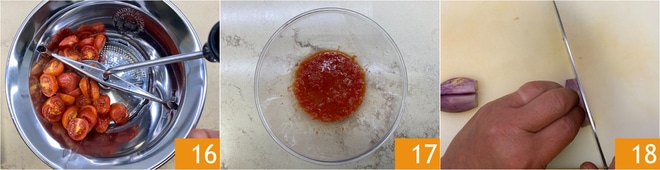 Retoma los tomates cherry y colócalos, poco a poco, en un pasa purés 16 para obtener una salsa lisa y homogénea 17. Corta finamente una chalota 18.