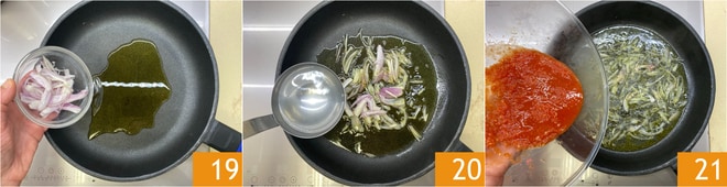 En una sartén vierte el aceite, añade la chalota 19 y sofríe por unos instantes, luego vierte un cucharón de agua caliente para que no se queme 20. Añade la salsa de tomates cherry 21, mezcla y deja que se impregne por unos instantes.