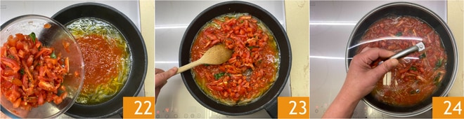 Añade la mezcla de San Marzano y piccadilly 22, luego mezcla 23 y cubre con una tapa 24. Cocina durante 4-5 minutos.