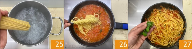 Mientras tanto, cocina los espaguetis en abundante agua hirviendo con sal 25, escúrrelos y transfiérelos a la sartén con el condimento 26. Aromatiza con unas hojas de albahaca 27.