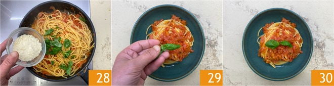 Espolvorea con el Parmigiano Reggiano DOP rallado 28 y remueve durante unos minutos, añadiendo un poco de agua de cocción si es necesario. Sirve, decora con unas hojitas de albahaca 29 y sirve de inmediato tus espaguetis a los tres tomates 30!