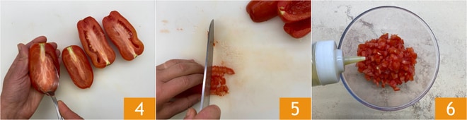 Mientras tanto, encárgate de los tomates San Marzano: una vez lavados, divídelos por la mitad y, con una cuchara, vacía el interior para eliminar las semillas 4. Luego córtalos primero en tiras y luego en trocitos 5. Recógelos en un bol y condimenta con aceite 6.