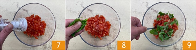 Regula de sal 7, añade la albahaca desmenuzada groseramente con las manos 8 y el orégano. Mezcla 9 y reserva.