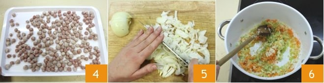 A medida que formes las albóndigas, colócalas en una bandeja enharinada 4, después cubre con film y reserva. Ocúpate ahora de la salsa de carne: pica finamente el apio, la zanahoria y la cebolla 5 y sofríe lentamente con un poco de aceite 6.