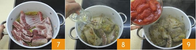 Añade la carne 7 y deja dorar bien, luego añade el vino blanco 8, deja evaporar un momento y después añade los tomates pelados 9.