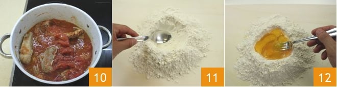 Mezcla para dar sabor a la carne 10, salpimienta, cubre con una tapa y deja cocer durante unas 3 horas. Mientras tanto, prepara la pasta de huevo: tamiza la harina en un bol, después colócala en forma de fuente en la superficie de trabajo, luego forma un hueco en el centro 11 y vierte los huevos 12 que habrás mantenido a temperatura ambiente.