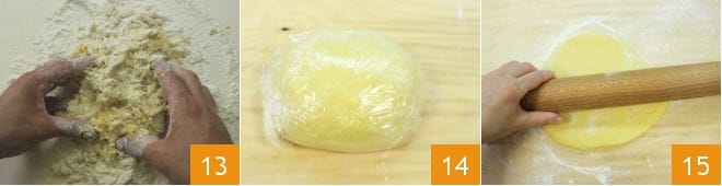Comenzando desde el interior, mezcla los huevos con un tenedor o con una cuchara, tomando poco a poco la harina de los bordes; trabaja después con las manos la masa 13 desde el exterior hacia el interior, amalgamando toda la harina que se encuentra en la superficie de trabajo. Envuelve entonces la masa obtenida en el film transparente 14 y déjala reposar durante aproximadamente 1 hora en un lugar fresco y seco. Tras el reposo, la pasta fresca resultará más suave y elástica: prepárate entonces para extenderla. Enharina la superficie de trabajo y provéete de un rodillo. Antes de extenderla aplana tu bloque realizando una ligera presión con los dedos, extiende la lámina con el rodillo hasta un espesor de aproximadamente medio cm 15.