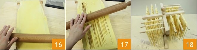 Una vez formada la lámina, enharínala bien y luego colócala sobre la “guitarra” 16. Pasa el rodillo por encima para cortar la pasta 17. Enharínala bien y colócala sobre un tendedero de pasta de madera 18 o forma un nido que pondrás en una bandeja con papel de horno enharinado o un paño, también enharinado.