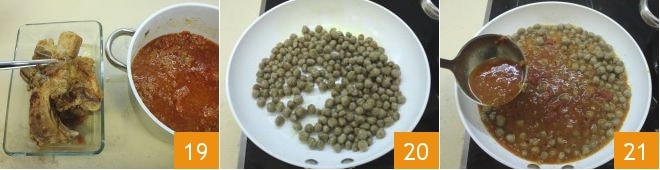 Extrae los trozos de carne cocidos en la salsa y resérvalos 19, coloca las albóndigas en una sartén y saltea unos minutos con un poco de aceite 20, luego vierte la salsa sin los trozos de carne 21.