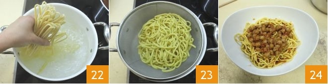 Coloca en el fuego una olla llena de agua salada y llévala a ebullición, vierte los espaguetis 22 y cuécelos durante unos 5 minutos. Escurre la pasta 23 y condiméntala con la salsa 24, excluyendo la carne, que podrás usar para acompañar el plato.
