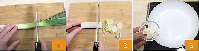 Para preparar las tortitas con juliana de puerro y speck, toma el puerro, límpialo bien, elimina las hojas verdes 1 y córtalo en rodajas bastante finas 2. En una sartén antiadherente derrite la mantequilla 3,
